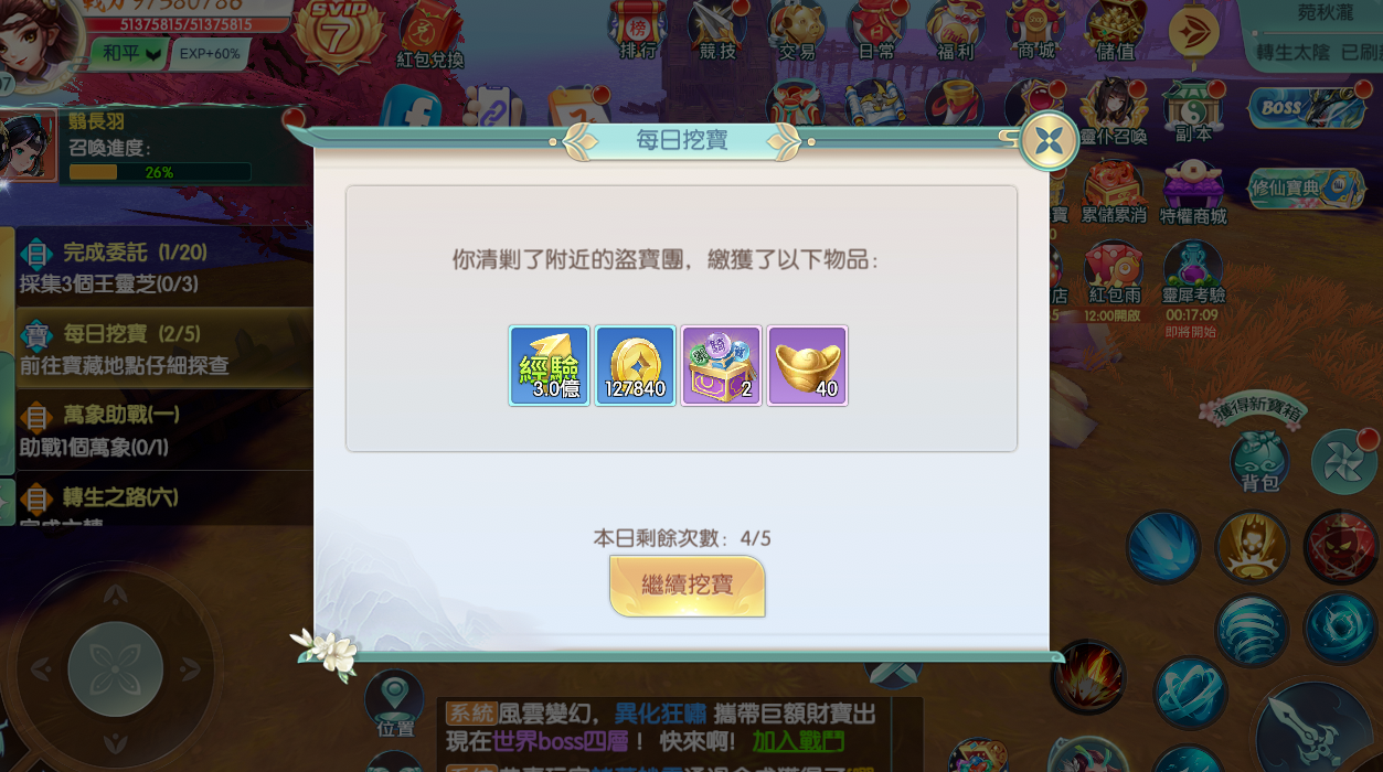 2.在指定地點進行挖寶後會隨機產生不同的事件,會出現寶藏BOSS,中級,高級寶箱,還會出現藏寶洞