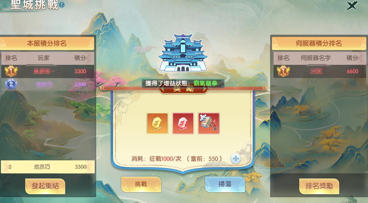 3.本服積分榜,會收集本服的所有玩家的積分後,進行排名,排名越高,本服獎勵越高。